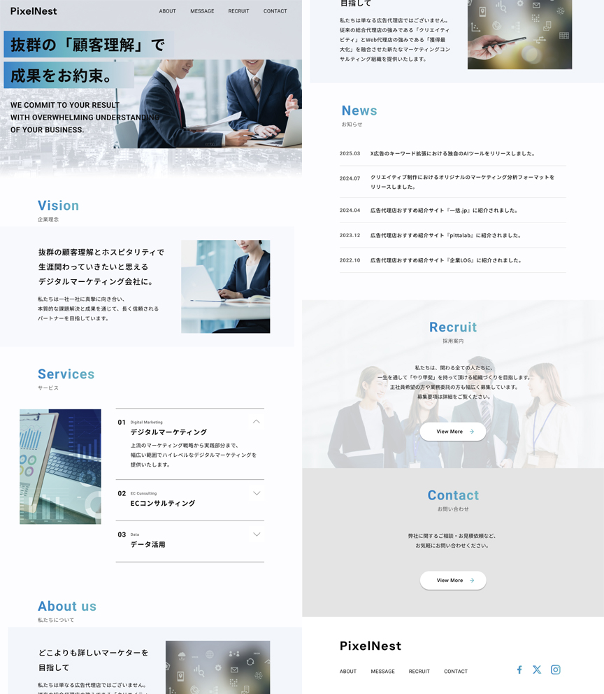 信頼感のあるホワイトやブルー系のカラーを使い、アクセントにグラデーションを使うことで時代に合ったスタイリッシュさを演出しています。また、情報が見やすいようシンプルなレイアウトにしました。 サービス概要は矢印をクリックすることで説明文が表示されるアコーディオン式にすることでコンパクトに、ページ下部まで進みやすい工夫をしています。 採用案内とお問い合わせのボタンには影を付け、立体的にすることで思わずクリックしたくなるデザインを意識して作成しました。 Facebook、X、Instagramへの移動もスムーズに行えるよう各SNSのアイコンをフッターに配置しています。