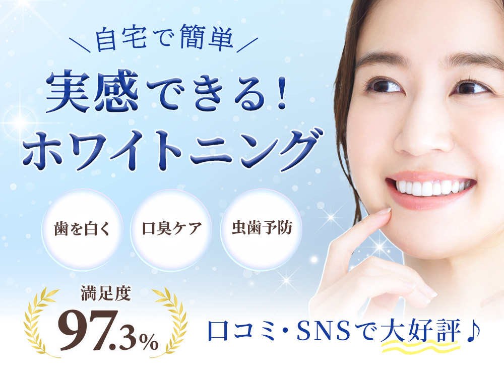 商品のイメージに合わせ清潔感のあるブルーのグラデーションとキラキラとした装飾を使い白い歯が引き立つデザインにしました。タイトルの文字や満足度の数字の大きさを変え、強調したい部分が目立つようメリハリを意識して作成しています。