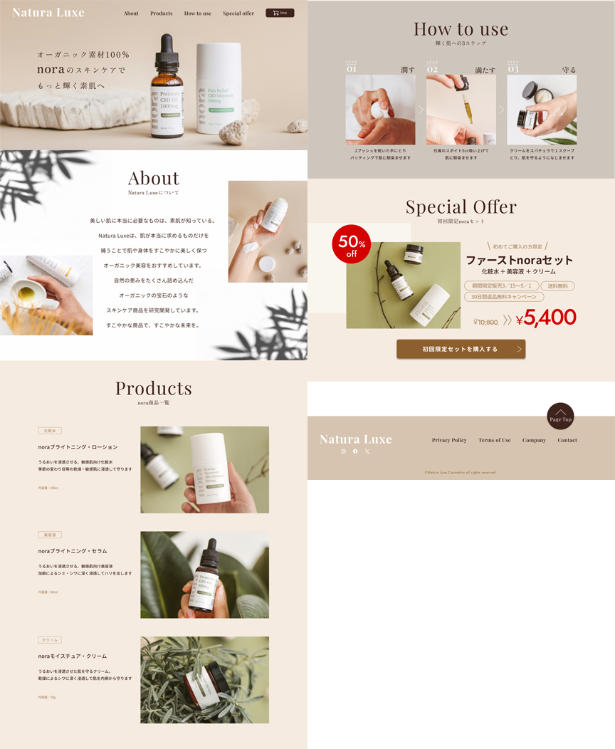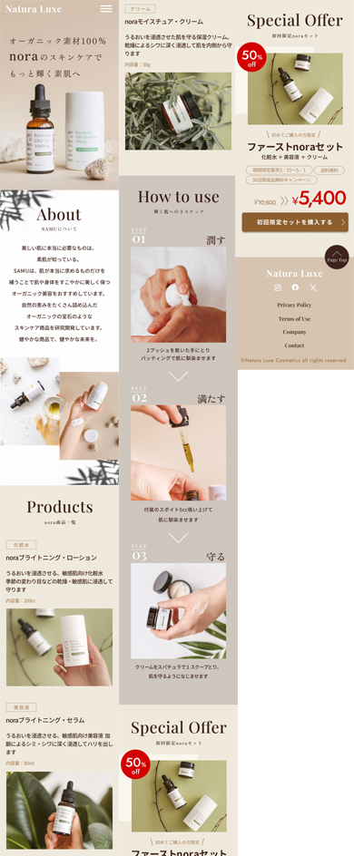 家族みんなが安心して使える基礎化粧品のため、ナチュラルで素材の良さが感じられるようなデザインにしました。全体的に同系色でシンプルな構成にまとめることで高級感を出し、セール情報の部分に鮮やかな色を使用し文字の大きさを変えることではっきりと目立たせています。